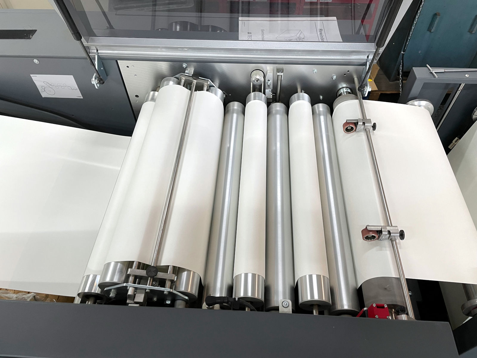 Nach dem Aufwickeln der bedruckten Formulare können diese zu einer Abwickelmaschine 550 transportiert und dort einer Kuvertiermaschine oder einem Offline-Schneideplotter zugeführt werden. Optionale Rollenwagen erleichtern die Handhabung, das Be- und Entladen der Rollen. Die Aufwickelmaschine 555 kann zudem mit dem Schwerpapier-Kit ausgestattet werden und unterstützt so Anwendungen bis zu 250 g/m² für grafische Zwecke wie Fotobücher, Kalender, Broschüren und vieles mehr.